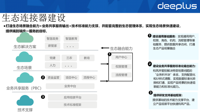借助于组装式应用程序开发理念,我们层层往上,通过不同的PBC形成一个新的生态场景,再通过不同的生态场景形成一个新的生态解决方案,从而打造生态场景融合能力+业务共享服务输出+技术标准能力支撑,并配套完整的生态管理体系,实现生态场景快速建设,提供端到端统一服务的目标,这是我们的生态连接器上的总体建设。