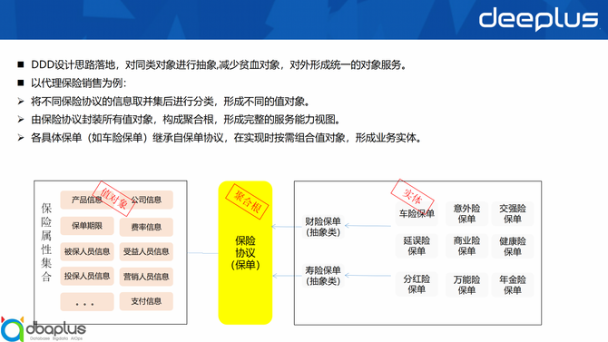 以某代理保险销售应用为例:抽取保险协议的实体和值对象,做抽象类的聚合和设计。实体分为财险保单和寿险保单两大类,值对象指的是保单上的各种属性,包括产品信息、公司信息、保单期限、费率信息等。未来我们在值对象设计上可能会做一些技术手段,通过定制手段自动化地动态展示前台页面等,形成了整个聚合根和实体的值对象,从事件风暴来讲,也就是梳理出用例,再进行组装式的开发。