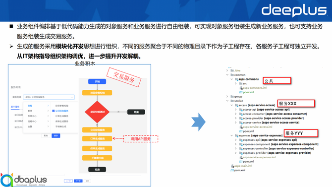 整体设计完之后,通过业务组件编排进行积木组装,这一方面与低代码能力也是息息相关的。业务组件编排基于低代码能力生成的对象服务和业务服务进行自由组装,可实现对象服务组装生成新业务服务,也可支持业务服务组装生成交易服务。