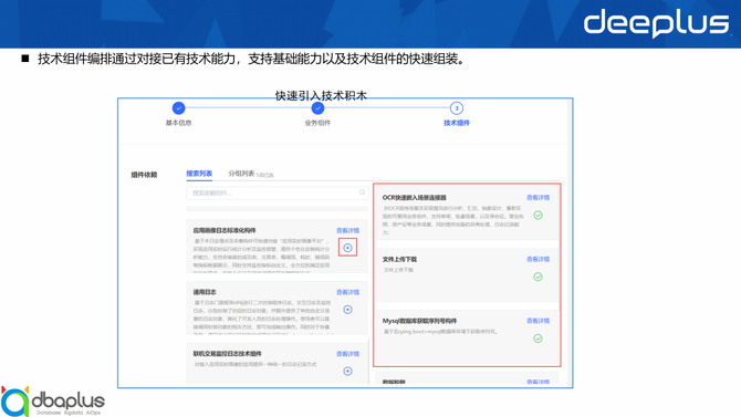 技术组件编排通过对接已有技术能力,支持基础能力以及技术组件的快速组装。行内通过共建形成了一套标准的技术组件,可以将建设好的技术组件直接引入平台,令大家自行选择需要的组件和能力,从而为整个PBC的建设包括应用建设形成组装。