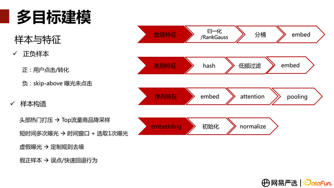 在多目标建模中,我们选取用户的点击与转化行为为正样本,根据 Skip-Above 原则,选取曝光未点击的样本作为负样本。此外,在样本构造中还会注意以下几个优化点: