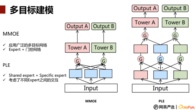 目前业界主流的多目标建模的网络结构是 MMOE[2] 和 PLE[3] 两种,我们也分别迭代了这两种结构。MMOE 是基于专家网络和门控做多任务学习的框架,它的特点是每个任务有单独的门控网络,同时在底部共享几个专家网络,通过不同的门控网络去控制专家网络对于不同任务的权重贡献。PLE 是在 MMOE 的基础上更加细粒度化,在专家网络共享的同时,还给每个任务单独提供独有的专家网络。这个独有的网络会去强化每一个任务的权重学习,能够有效地避免在 MMOE 中可能由于某些任务的训练占主导地位,带偏小任务的问题;也可以让不同任务的专家,通过集成方式,进行权重交互。