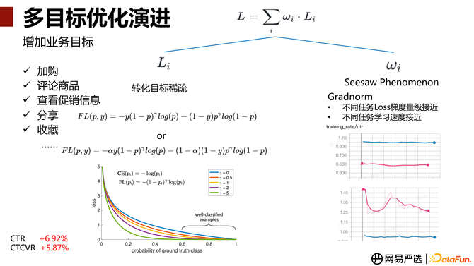 多目标损失优化,引入 Focal Loss 和 GradNorm 控制损失权重后,整体上线 AB 实验,CTR +6.92%,CTCVR+5.87%,都有显著提升。