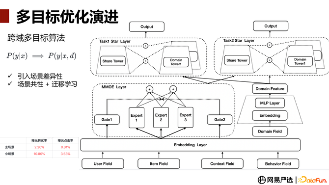 此外,在 CTR 跟 CVR 目的基础上根据业务方的需求增加更多的目标,包括加购、评论商品、查看促销信息、分享、收藏等。有些目标如收藏、分享的转化数据相对会比较稀疏,这些任务与 CTR、CVR 样本比较丰富的任务一起训练时,由于样本过于稀疏,会导致训练不够充分,被带偏。