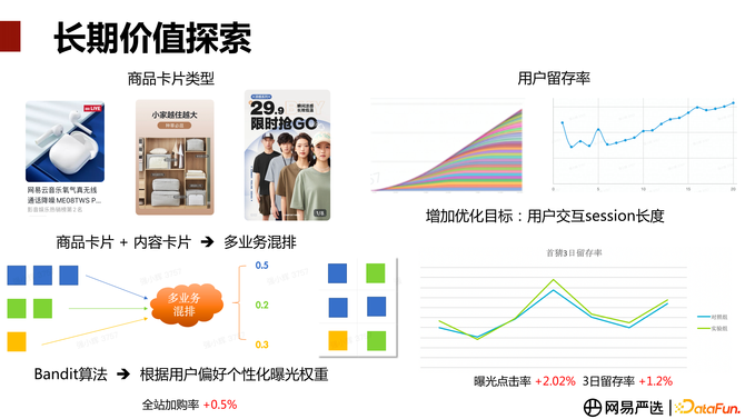 此外,我们还做了一些提升长期价值的探索工作,分别是多业务混排和用户留存优化。我们有很多业务模块,除了向用户透出商品卡片,还需要拓出场景化的如榜单、清单卡片、活动卡片等,这些信息在同一个模块展示,如何做到个性化的页面布局,需要做混排策略,我们基于汤普森采样算法[7],根据线上用户的实时行为交互,做 Reward 反馈,这个反馈对每个用户去拟合 Beta 分布,在 Beta 分布上算用户对三种卡片的点击概率。如果用户刚点击过很多场景化卡片,可能后续会推更多场景化卡片。但场景化或者活动性卡片,对于我们的业务价值可能不如商品卡片那么高, 如何判断混排这个动作到底有没有价值,需要去做比较长时间周期(1个月以上)的 AB 实验 ,观察单个模块和全站数据表现,如果全站 UV 价值和全站加购率提升,那混排就是有价值的。