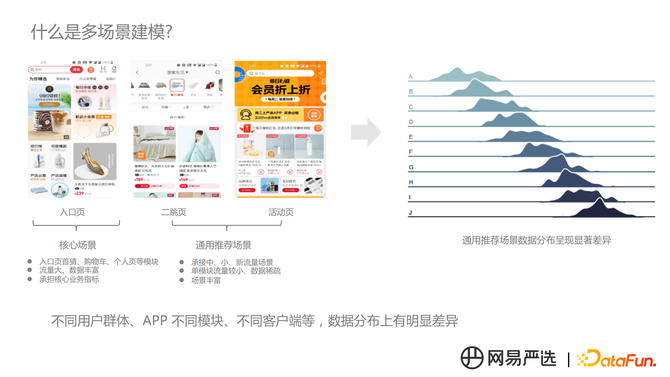 关于多场景建模,没有确切的定义,与学术上迁移学习和跨域推荐比较接近。在实际建模方案落地中,主要考虑如何捕获场景间的共性,同时保留各个场景的数据本身的特点。机器学习有个基础假设,训练数据要服从独立同分布,实际上各场景的训练数据的分布存在显著差异。