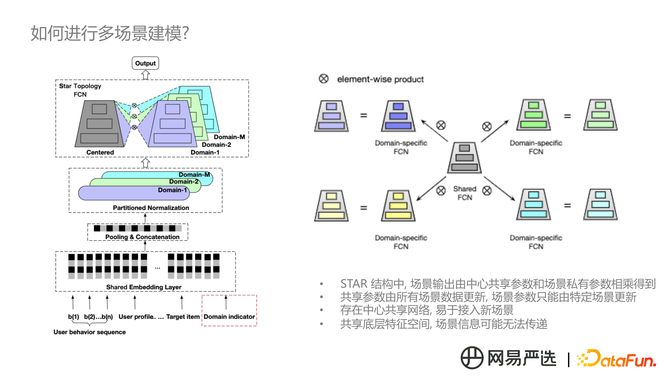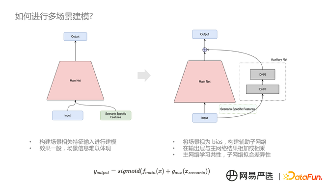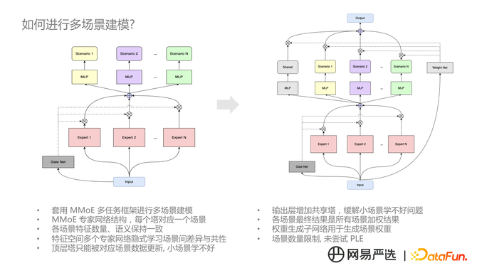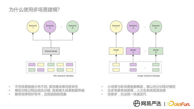 另外一种极端做法,如上右图是针对每个场景,都建立一个模型,这样做的问题是小场景或新接入场景的数据比较稀,少量的样本很难训练出比较好的模型。同时维护成本非常高,迭代不方便。