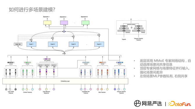 最后的方案还是以 MMOE 为基础,底层特征共享,MMOE 专家网络结构自动选择场景间共享信息,同时针对每个场景考虑特征来源,上图中右上角为各场景的输出结构,由 MMOE 专家网络和底层的场景特征信息直接传递,并行输入。左侧场景 MLP 参数私有,右侧 MLP 参数共享。