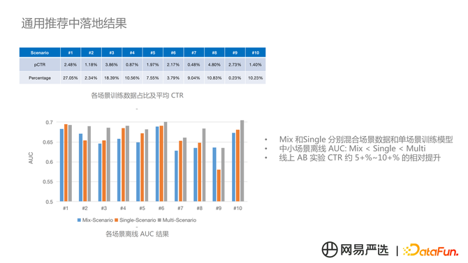 接下来看下在通用推荐场景中的落地情况,上图中列举了 10 个场景,其中 Mix 和 Single 分别表示用混合场景和单场景数据去训练模型,Multi 代表多场景建模。从 AUC 结果可以看到,如果场景数据量比较充足的情况下(#1),单场景数据训练的 AUC 高于混合场景数据训练,同时和多场景建模是 AUC 基本持平。对于小场景(#9),数据稀疏,单场景数据训练效果不好。线上效果是在某些场景 pCTR 有 5%-10% 的提升。