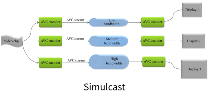 所谓 Simulcast,就是将一个视频源输入编码输出成多个分辨率的视频帧,在发送端编码多路不同分辨率的大小流,下行接收端可以选择订阅其中任意一种分辨率的同源视频流。它可以满足多人通话场景,不同用户对于分辨率的差异化需求。在实际应用中,Simulcast 变得更加灵活多变,发挥的作用也越来越大。除了满足用户差异化的分辨率需求外,还可以有效解决下行弱网/性能问题,提升用户体验。比如在下行用户网络交较差或者性能较差时,可以给用户转发低分辨率的视频,确保用户可以拥有流畅的观看体验。