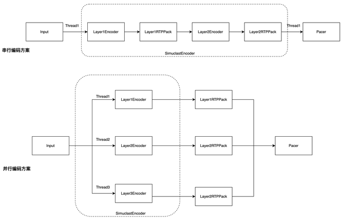 火山引擎 RTC Simulcast Encoder 之间采用完全并行的编码方案,每条 Simulcast 流处在不同的 Pipeline 上,线程之间相互不影响。相比 WebRTC Simulcast Encoder 之间串行的编码方案,并行编码方案效率更高, 并且编码效率基本不受 Simulcast 流数的影响。