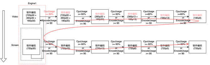 降级编码器指,降级编码器档位,或者切换到性能更好的编码器。通常,编码压缩率越高的编码器,编码性能消耗越高。因此,当系统负载较高时,可以切换到压缩率相对低的编码器或者编码档位,降低性能消耗。
