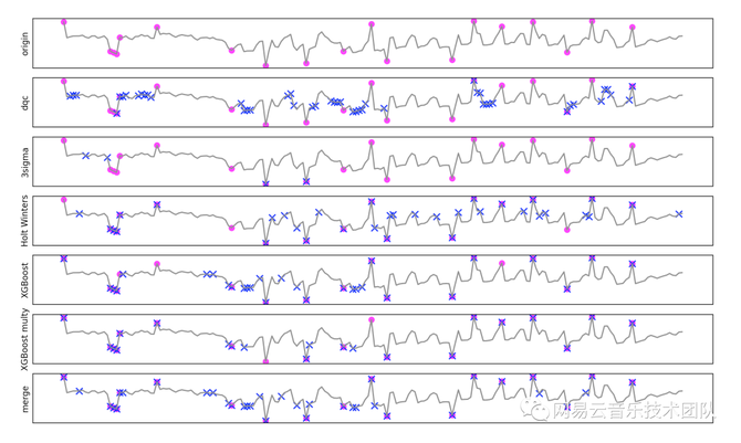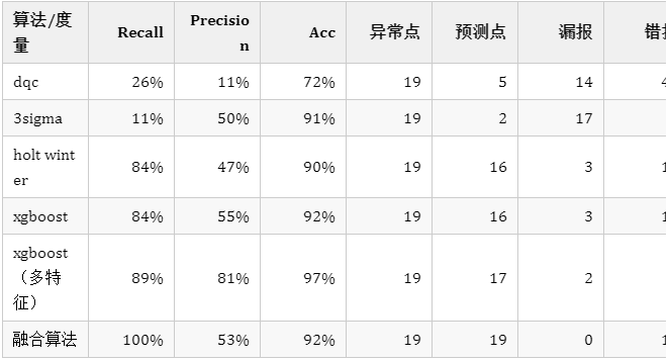 XGBoost算法的表现明显优于dqc、Holt Winters等算法,能找出最多的异常点并且错报最少。
