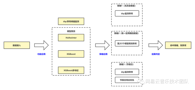 考虑到dqc异动发现阈值设置严格时的误报,以及dqc阈值设置宽松时漏报,通过整合算法预测异常在多个指标的表现优势,制定策略集,进而判定指标异常与否,示意图如下: