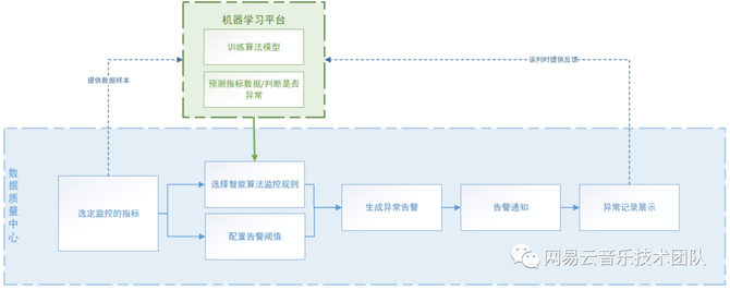 拓展“数据质量中心”功能,在DQC监控功能的基础上,接入机器学习平台。功能流程如下: