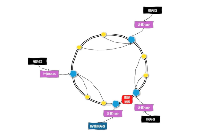 一致性哈希可以按照常用的hash算法来将对应的key哈希到一个具有2^32次方个节点的空间中,形成成一个顺时针首尾相接的闭合的环形。所以当添加一台新的数据库服务器时,只有增加服务器的位置和逆时针方向第一台服务器之间的键会受影响。