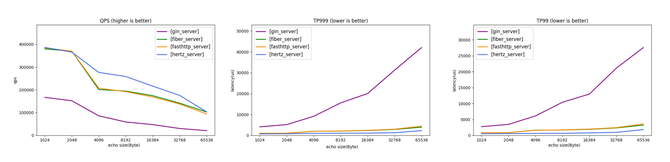 在满足上述要求的前提下,我们基于当前最新版本对多个框架进行了压测对比,压测代码在 hertz-benchmark 仓库。在充分压满 Server 的目标下,Hertz 的 P99 延迟在所有压测框架中最低,吞吐也是属于第一梯队,且在持续优化中。