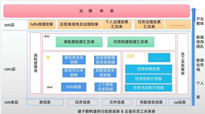 基于获取的元数据内容进行元数据建模。通过对元数据和云音乐内部数据的一系列的处理,产出了丰富的元数据cdm层的宽表和维表。通过模型产出的报告可实现从更多的视角观测数据现状和任务现状,可以分析的粒度有:整体平台数据,数据使用团队、数据业务域、个人、表。整个建模内容支撑了体系化的治理方案。