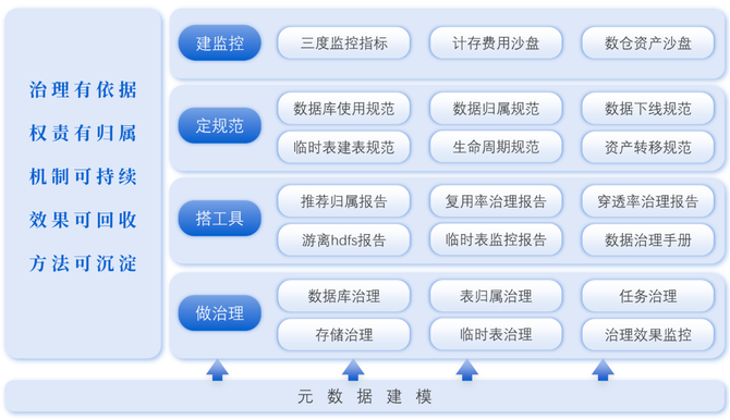 治理的依据是元数据;权责有归属是定位谁的问题谁来治理;机制可持续是在治理的过程中沉淀出一套可推行的机制和原则;效果可回收是每一项都能拿到相应的结果;方法可沉淀整个治理方案可以进行横向复制推广。