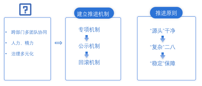 在进行实际治理项目执行的过程中,每个治理事项所面临的问题、治理的内容和治理步骤都是差异且多元化的;治理项都面临着跨部门,多团队协作,在人力精力投入比较分散;在这些问题的背景下我们建立了统一的推进机制以及推进原则。