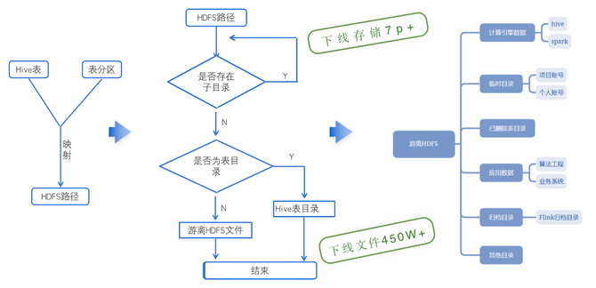 在游离hdfs文件的治理,通过hdfs元数据和hive元数据的关联匹配逻辑和文件的访问情况,进一步计算出游离的hdfs文件;通过找到游离文件的生产方进一步确认文件是否还有存在的必要,并推进无效文件下线动作。现阶段通过这种方式梳理出来的游离文件有计算引擎遗留数据、未清理的临时目录数据、删表未删文件的数据,算法和工程任务的无效应用数据、实时任务无效归档数据等。通过对这些游离数据的清理,目前拿到的效果是非常显著的,释放了7p+以上的逻辑存储空间,清理掉了450w以上的文件和目录。