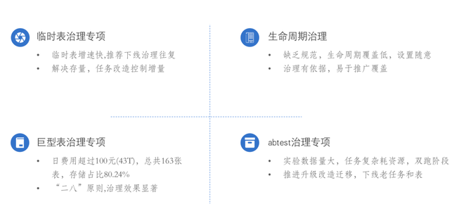 第一个是临时表治理,早期临时表面临着存量大,增速快的问题,经过一期的的治理解决了大量存量的问题,增速快的问题后面通过元数据建模产出的报表,推进线上任务改造的方式较好的解决了增速快的问题。