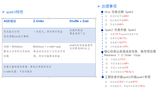 云音乐集群是在21年年中上线了spark3执行引擎,经过大半年的使用,我们确实在spark3上体验到了非常棒的效果,网易数帆大数据团队的同学也在spark3上进一步做了大量的优化,例如AQE增强优化、zorder功能以及shuffle阶段采用zstd压缩算法。为了能够更好的兼容升级过程,大数据团队也在spark引擎上内置了大量优化参数。当前spark3引擎在计算资源、存储资源、小文件问题上获得了大幅的提升。在这个背景下我们在22年Q2阶段开始任务迁移至spark3的专项。涉及的迁移事项有