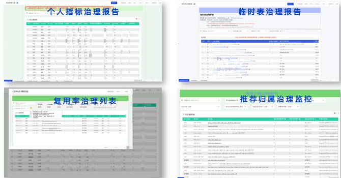 针对每一项治理,我们都有产出相关的跟进工具,例如 个人指标治理报告、临时表治理监控报告、“三度”指标治理列表、推荐归属治理监控、下线治理报告、任务升级跟踪报告等等