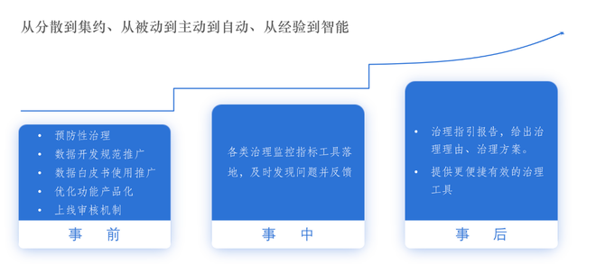 数据治理是一件长期并且持续要进行的事情,如何达到更好的治理效果?我们整个治理过程遵循理念是:从分散到集约、从被动到主动到自动、从经验到智能。在这个理念的基础上,我们的治理是按事前、事中、事后三个步骤管理治理事项。其中最为重点的是事前事项,事前的动作都是预防性的动作,预防做好、事后无忧。