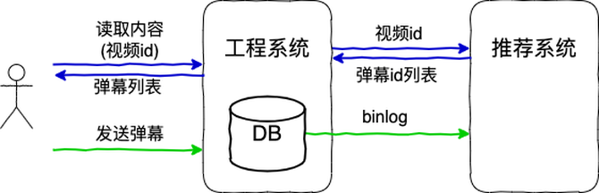 发送弹幕时,工程系统通过数据库binlog同步给推荐系统。在展示侧,由推荐系统负责计算对应视频要展示的弹幕id列表,工程系统获取弹幕内容最终返回。这样就实现了一个具备基础能力的弹幕推荐系统。