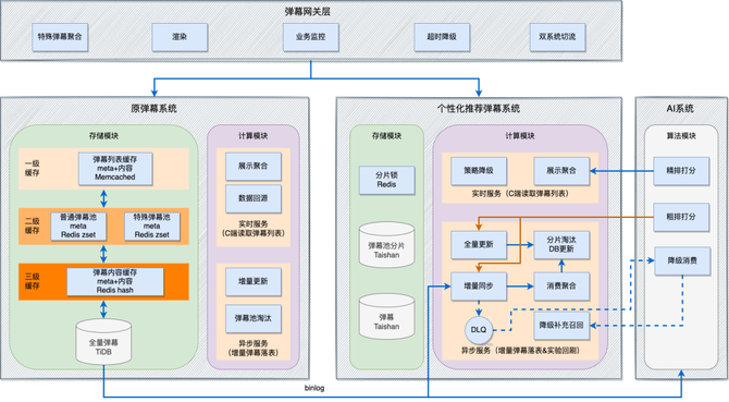 这套架构存储相对复杂,因为弹幕池的存储强依赖于Memcached和Redis zset,在容量扩展上,很难支持个性化推荐的业务诉求。同时视频维度时间序淘汰这一固定逻辑也很难变更。这一阶段我们也思考过通过AI侧的弹幕质量粗排模型打分来代替时间序淘汰,但在现有架构下,整体数据刷新的复杂度、模型实验能力的支持、模型版本更新的数据回刷都成为瓶颈点。