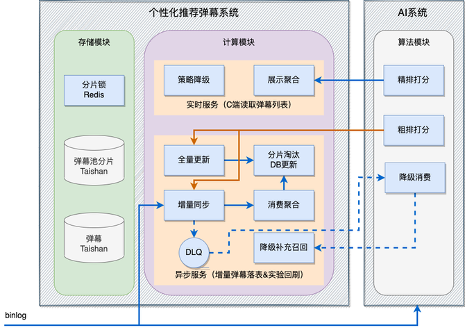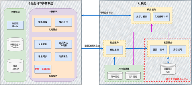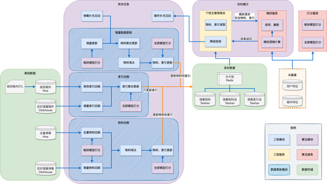 在前一个阶段,我们发现了基于原有弹幕池工程基建去搭建个性化推荐的问题。我们决定重新搭建一套专门服务于个性化推荐的工程系统。整体架构如下,后面会逐步展开介绍。