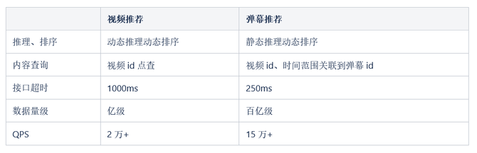 视频推荐是动态推理,即将随着视频播放不断产生的交互数据用于模型更新。弹幕推荐是静态推理,即在弹幕发送时就计算好全部的模型分数,不随着线上数据进行变更。这一点上,视频推荐的推理策略复杂度更高,而弹幕推荐的场景下更适合通过批量任务的方式优化离线模型分数的计算和存储。同时,内容查询复杂度、数量级、QPS和响应时间几个方面弹幕系统都需要满足更高的要求。在整体流程上,都由召回、粗排、精排这3个主要步骤构成,在召回和粗排阶段完成模型计算,在精排阶段进行用户特征的实时交互,从而实现个性化。