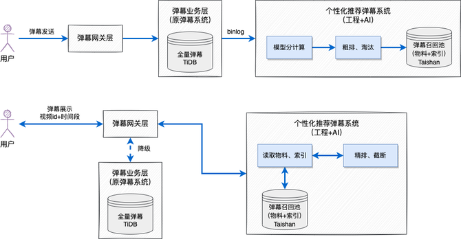 线上维持两套系统的常见问题是职责边界和关系不清晰,导致在迭代中逐渐走向混乱。我们在设计阶段就对两套系统做了明确的职责划分和关系定义:原弹幕系统负责整体的弹幕业务逻辑,新系统(图中个性化推荐弹幕系统)只为个性化推荐这一个场景服务。在存储上,原系统以TiDB存储全量弹幕内容作为source of truth,新系统的KV数据库作为个性化推荐的召回池,是TiDB数据库的子集。同时,在弹幕消费这一主要场景下,原系统以线上热备的形式维护。在个性化推荐系统出现故障时,可以自动降级使用户侧无感。