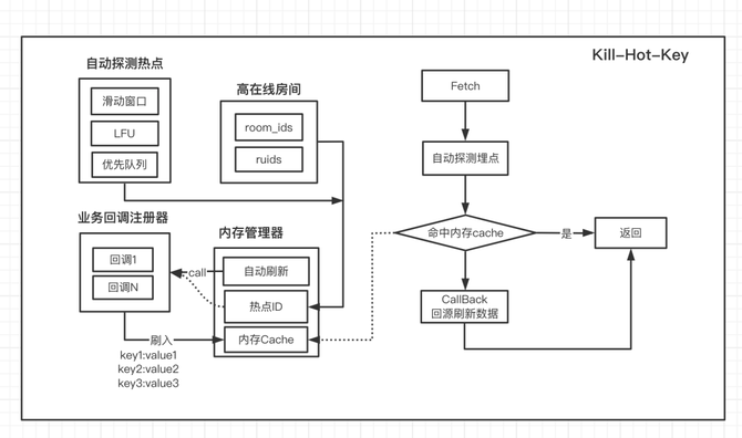 直播场景热key非常普遍,进房很容易将redis CPU被打满。基于高在线房间SDK + 自动探测热点SDK,封装了一套方便的热key解决方案,业务可以基于callback自动将热门数据写入内存。