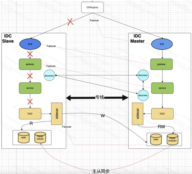 上面是送礼同城双活示意图,同城双活可以简单理解为,流量链路有两个主通道互为灾备,两个主通道共享同一套数据库,数据库通过主从实现高可用,这是单元化的前期阶段。