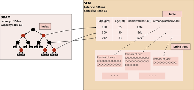 作为内存数据库,Tair 在绝大部分场景使用单次访问延时在 ns 级别的内存 / SCM 作为主要的存储介质。以 Table 存储为例,服务端的常驻数据大概可以分为 Tuple(可以认为是表里面的某一行)、String Pool、Index 三部分,这些数据都是存放在内存 / SCM 中,只有快照和日志会存放在磁盘上。
