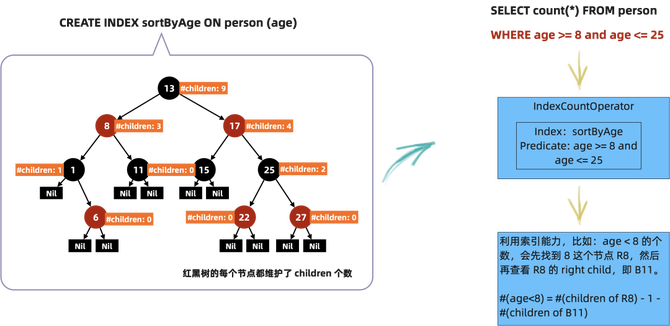 在数据库系统中,索引能力的增强还可以让执行器对外暴露更强的算子,比如 Tair 中的 RBTree 提供了快速计算两个值之间 Count 的能力,对外提供了 IndexCountOperator,这样类似于 Select count(*) from person where age >= 8 and age <= 25 的查询就可以直接使用 IndexCountOperator 来获取结果,无需朴素地调用 IndexScanOperator -> AggregateOperator对索引进行扫描才得出结果。