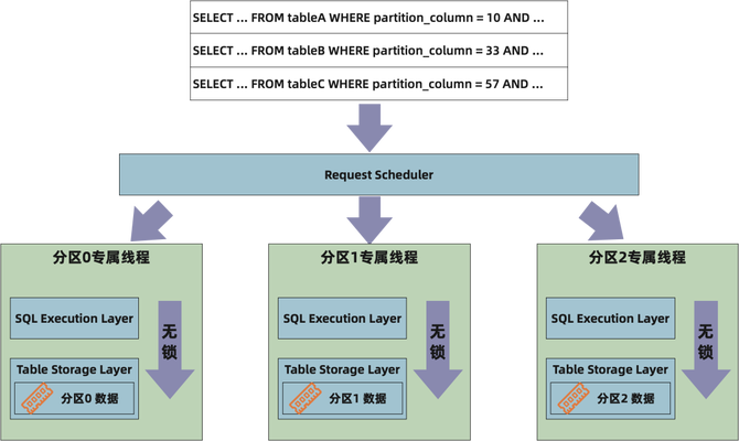 在提升单机引擎的并发上,SQL 场景使用了另外一种解法,让每一个 Partition 的数据由一个单独的线程来进行处理,这样能在引擎内部通过增加分区达到线性的扩展,而且无需使用前面提到的无锁实现中常会使用的重试步骤。相对于上面的方案,这种方案的工程难度更低,且能够天然地支持 Serializable 的事务隔离级别,某一特定时刻只有一个事务能够运行在特定的分区上,增加 undo buffer 即可以保证事务的原子性。