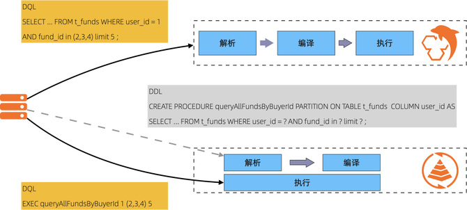 经典的 NoSQL 系统,提供的 API 都是和服务端的处理流程非常耦合的,比如说 Redis 提供了很多 API,光是 List 就有 20 多个接口。在服务端其实很多接口的执行过程中的步骤是比较类似的,比如说有一些 GenericXXX 的函数定义。我们再看看一般的 RDBMS 中的处理 SQL 的流程,一般是 解析(从 SQL 文本到 AST),然后是优化器编译 (把 AST 编译成算子,TableScan、Filter、Aggregate),然后是执行器来执行。类比到 Redis 中,用户传进来的就是 AST,且服务端已经预定了执行计划,直接执行就行了。如果我想使用 SQL,不想学习这么多 API,同时由于我的访问场景是比较固定的,比如进行模板化之后,只有十多种 SQL 语句,且访问的数据比较均衡,某一条特定的语句所有的参数用一条特定的索引就足够了,有没有办法在执行过程中省去解析、编译的开销来提高运行的效率?有很多同学可能已经想到了存储过程。是的,存储过程很多场景是在扩充表达能力,比如多条语句组成的存储过程,需要进行比较复杂的逻辑判断,单条语句存储过程本质上是在灵活性和性能上进行折衷。Tair 所有线上运行的 SQL 都是预先创建存储过程的,这样进行访问就类似于调用 Redis 的一个 API 了,这是在复杂计算逻辑的场景下保证低延时的一种方案。