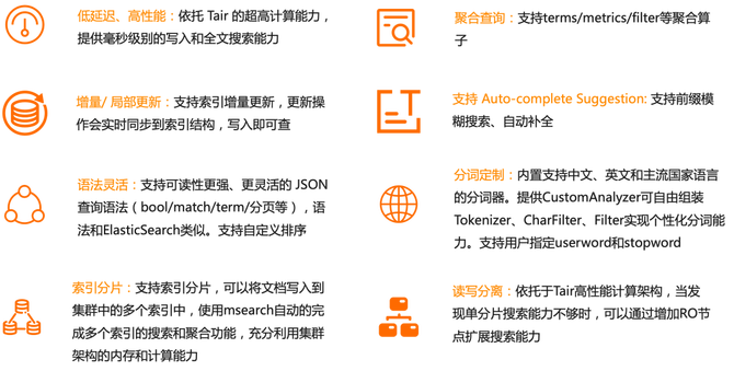 TairSearch 是Tair自主研发的高性能、低延时、基于内存的实时搜索特性,不但增强了 Tair 在实时计算领域的能力,还和现有的其他数据结构一起为用户提供一站式的数据解决方案。Tair采用了和 ElasticSearch(下文称之为ES)相似的基于 JSON 的查询语法,满足了灵活性的同时还兼容ES用户的使用习惯。Tair 除了支持 ES 常用的分词器,还新增JIEBA 和 IK 中文分词器,对中文分词更加友好。Tair支持丰富的查询语义和聚合能力,并且支持索引实时更新和局部更新。Tair 可以通过 msearch 方案实现索引的分片和搜索能力,并通过读写分离架构实现搜索性能的水平扩展。