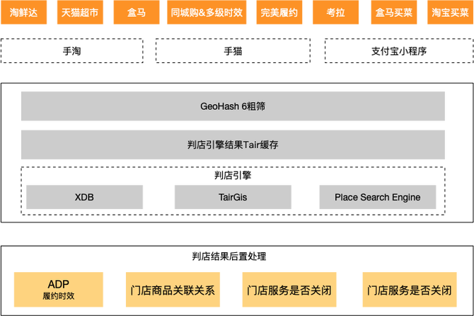 新一代判店系统,依托 Tair 的 Gis 能力,底层使用 RTree 结构,支持常见的 Contains, Within, Intersects 等关系判断,可以在 ms 级别返回查询数据,目前已经在淘菜菜、天猫超市、淘鲜达、盒马、同城购等多个业务使用。