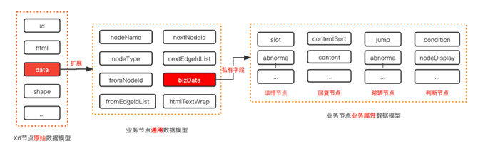 每个节点都有自己的业务属性,这里主要通过数据建模的思想把每个节点的业务属性以及关联关系属性做了抽象,其思路如下: