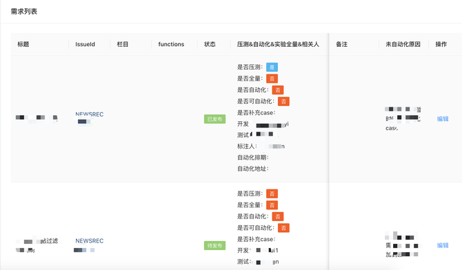推荐系统的每个需求正式上线前,一般需要在线上进行ab测试,数据符合全量条件后,除了工程代码需要全量,测试case也相应需要加入到回归case中,但由于需求量大,很容易在增加全量回归case时遗漏部分需求,所以为使需求管理更明确,避免漏掉某些全量需求,结合推荐测试现状在测试中增加需求管理,清晰直观的展示目前case现状。