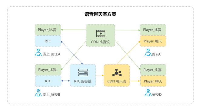 该方案的优势是可以快速复用线上业务语音聊天室的主播、观众代码,以及复用当前线上业务中上麦、下麦流程,快速搭建该玩法场景。但这个方案也存在一个问题, 即未上麦的用户(图中好友 C、好友 D)听到的聊天内容会有较大的延时, 麦下用户会在进球后大约 1~3 秒(CDN 转推延时)才能听到麦上用户聊进球相关内容,这会导致比赛进程画面和聊天内容不同步、聊天内容延时大,对于需要“同频共振”的大型赛事观播是无法接受的体验。