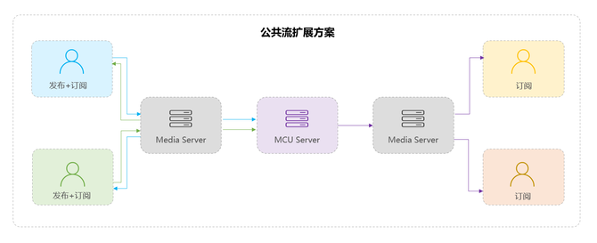 常规方案在房间人数多时会面临诸多性能压力,因此我们又设计了一套公共流扩展方案。在公共流方案中,发布端(上麦用户)仍然使用常规方案的设计,媒体服务器只需要纯转发,不需要做过多额外的处理;订阅端(闭麦用户)则订阅经过 MCU(Multipoint Control Units,多点控制单元)服务器处理的公共流,在这个架构下,用户的订阅流数降低至 1 路。