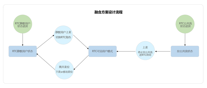 (3)用户在上麦时切换为常规 RTC 方案“有房间”的模式,可以保证用户实时的交互音视频体验。在切换为有房间模式后,后续的上下麦则不会再变更模式,保证了用户的平滑体验。