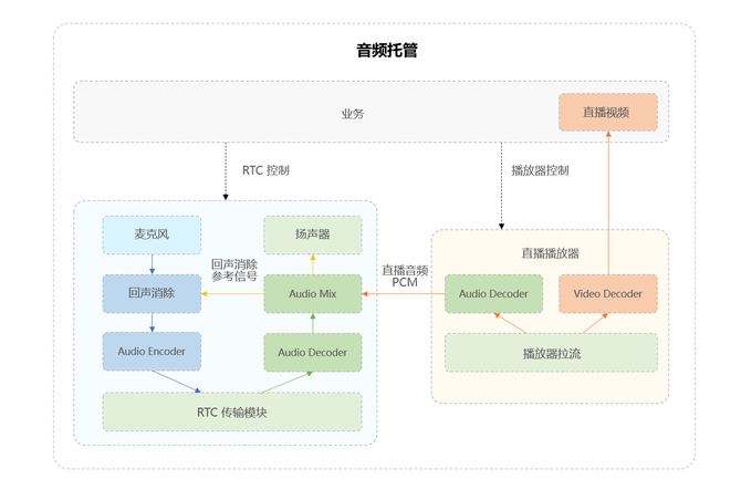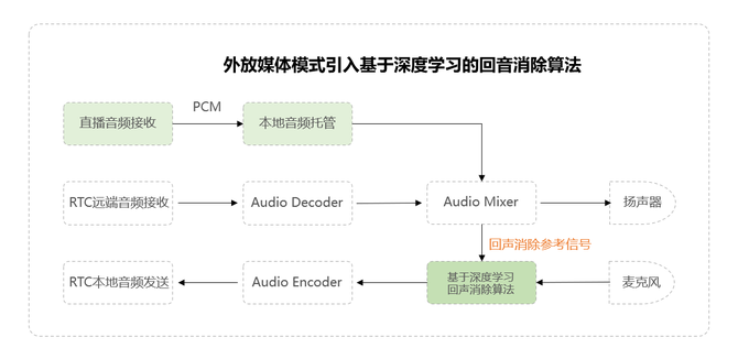 为了解决边看边聊场景的回声问题,RTC 和播放器提供了播放器音频托管由 RTC 来播放的解决方案,由播放器将解码后的直播音频数据调用 RTC 音频托管接口来播放;在 RTC 内部,直播音频会和远端用户音频进行混合,再调用系统音频播放接口进行播放,同时将混合信号送到 RTC 回声消除模块,回声消除模块会将麦克风采集到的声音中的远端音频和直播比赛声音消除,这样就得到了没有回声的本地人声数据,这些数据会在编码后送到远端,避免了回声问题的出现。