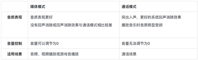 在移动端设备上,音频播放区分通话模式(通话模式音频通道)和媒体模式(媒体模式音频通道),二者在音质表现、音量控制上略有不同,从而适用于不同的业务场景, 具体表现如下: