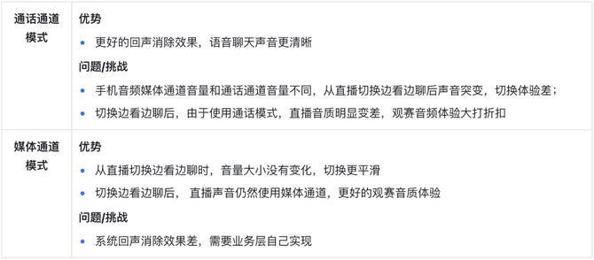 由于边看边聊场景是在直播间观看比赛过程中开启音频通话,我们既要保障通话没有回声,也要保障直播音频音质;我们分别对边看边聊场景 RTC 使用媒体通道和通话通道进行了对比测试结果如下: